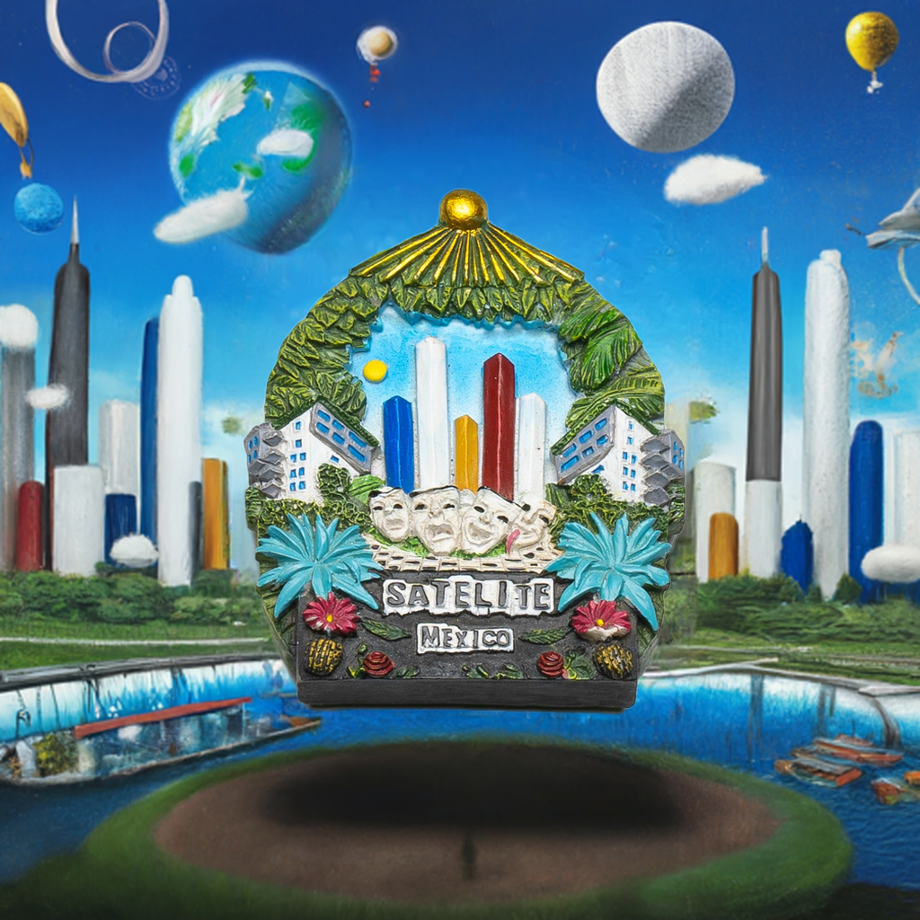 Vislumbra un futuro sostenible con este diseño que representa una Ciudad Satélite verde y avanzada. Un imán de colección que simboliza energías limpias, inteligencia artificial y una sociedad multicultural.